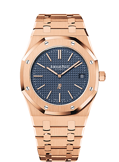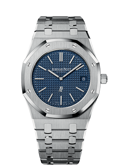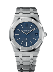 About this WatchThe Audemars Piguet Royal Oak Extra-Thin stands at only 8.1mm. The extra-thin depth makes this watch ideal for wearing underneath jacket sleeves or suits. The dial includes Audemars Piguet's signature Petite Tapisserie pattern and a date window at 3 o'clock.
