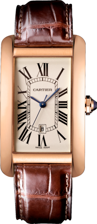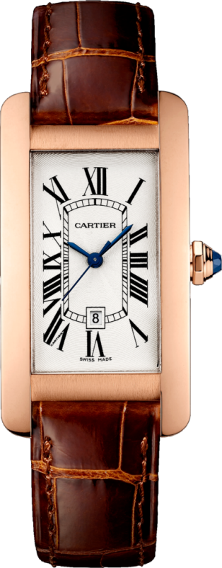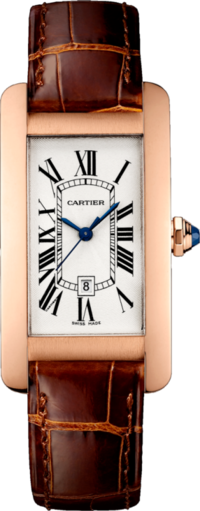 About this WatchFeaturing an elongated case with a more pronounced curve, the Cartier Tank Americaine distinguishes itself from the original model. Available variations include a medium or large model in 18k pink gold. The brown leather strap accents the warm color of the watch case.