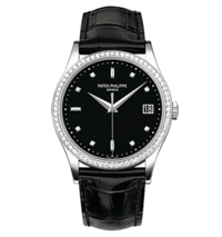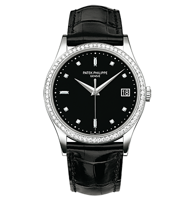 About this WatchThis Patek Philippe Calatrava offers men a white gold case set with 68 diamonds and a matt black dial with diamond hour markers. The watch is available with a shiny black alligator leather strap.