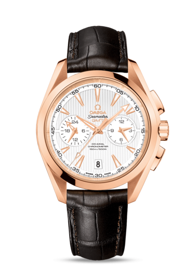 About this WatchThe Omega Seamaster Aqua Terra 150m Co-Axial GMT Chronograph 43mm features two sub-dials, one at 9 o'clock and the other at 3 o'clock. The 9 o'clock sub-dial offers both a GMT hand and a small seconds hand. The 3 o'clock sub-dial features sixty-minute and twelve-hour chronograph counters.