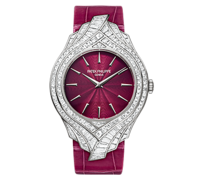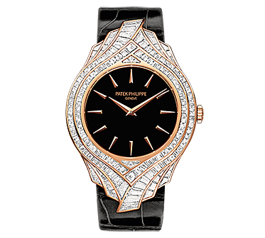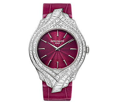 About this WatchThe case on this Patek Philippe Calatrava 4895 is set with 162 baguette diamonds and the prong buckle is set with an additional 20 baguette diamonds. The rose gold model comes with a black lacquered dial, rose gold applied hour markers, and a black alligator leather strap. The white gold model comes with a dark purple lacquered dial with a guilloché design, white gold applied hour markers, and a dark purple alligator leather strap.