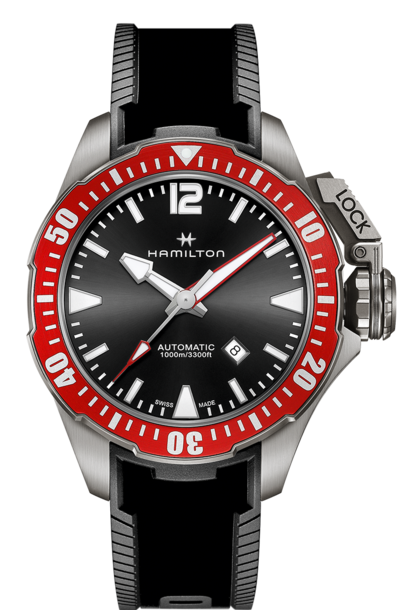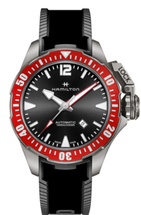About this WatchThe Hamilton Khaki Navy Frogman Auto was created for the US naval “frogmen” teams. This Hamilton military watch is well-built and able to withstand anything you can throw at it. The 46mm titanium case version features a red aluminum unidirectional rotating bezel, and the watch is water-resistant up to 100 bar.