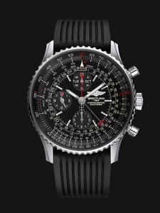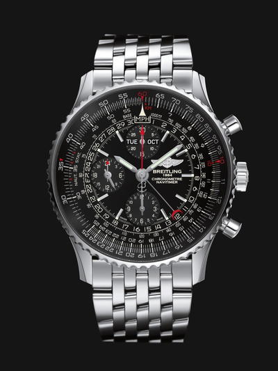 About this WatchIn the Navitimer 1884, Breitling combines the signature 1952 aviation slide rule with a triple calendar. The triple calendar, also known as the complete calendar, was a classic Breitling feature from the 1940s. This triple calendar includes a pointer date, day of the week, and month all displayed in the 12 o'clock sub-dial. Additionally, this watch features 24-hour military time at 9 o'clock that also works as a day/night indicator.