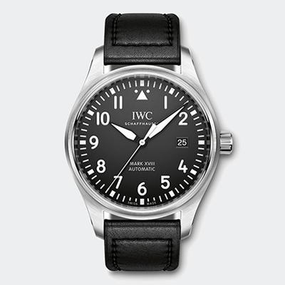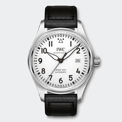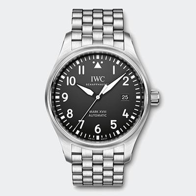 About this WatchThe IWC Pilot's Watch Mark XVIII is a stainless steel pilot's watch avaiable with a stainless steel bracelet or a black calfskin strap. Buyers can also choose between a black or silver-plated dial.