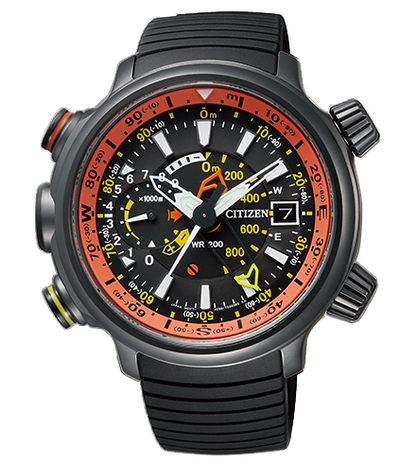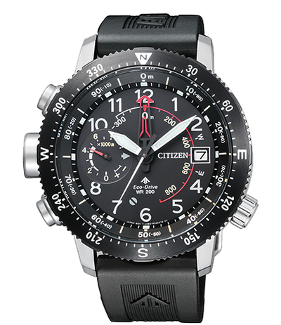 About this WatchThe Citizen Promaster Eco-Drive Altichron is includes an altimeter that measures -300 meters to 10,000 meters. An altimeter is an instrument for determining altitude attained. The watch also features an electronic compass, an anti-shock function, 20 bar water resistance, and luminescent hands and indexes.