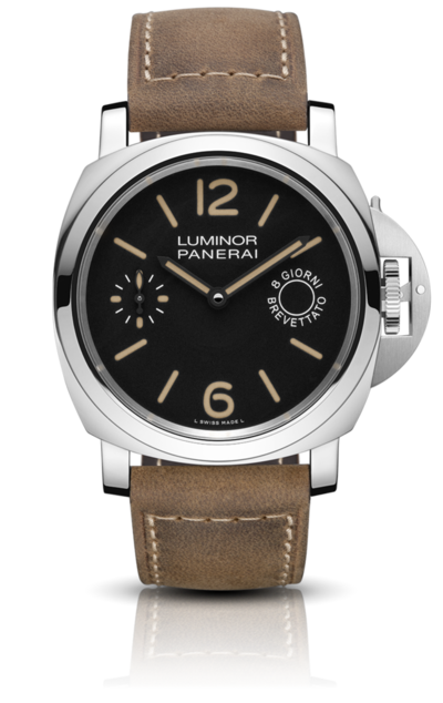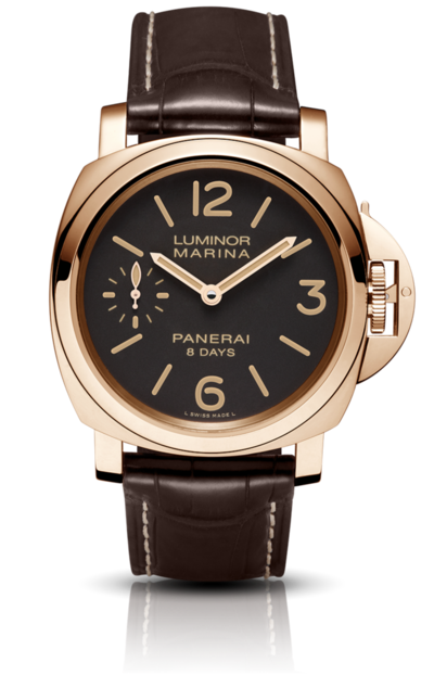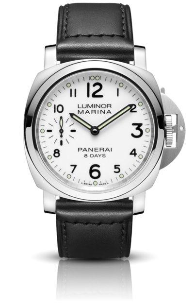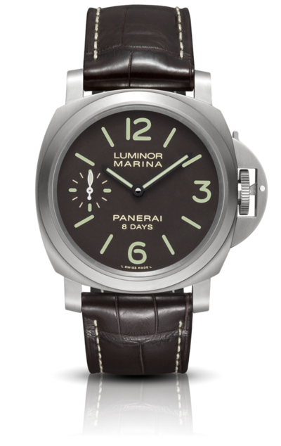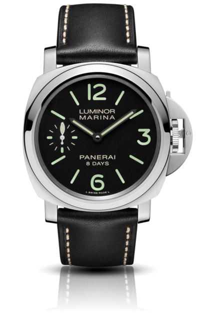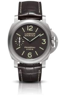 About this WatchThe Panerai Luminor Marina 8 Days features a 30-bar water resistance, an 8-day power reserve, an anti-shock device, and a small seconds sub-dial at 9 o'clock. As for the hand-wound mechanical movement, it is created entirely in-house and it inlcludes 21 jewels and 127 components.