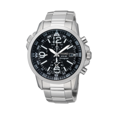 - Chronograph up to 60 minutes in 1/5 second increments Split time measurement Alarm Energy depletion forewarning function Overcharging prevention function Rotating Compass Ring Screw Case Back Three fold clasp with push button release