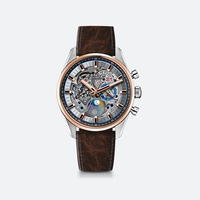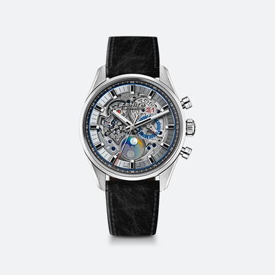 About this WatchThe Zenith El Primero Grande Date Full Open skeleton dial allows wearers to watch the movement at work. The watch offers a chronograph, a tachymeter scale, a moonphase and sunphase indication, and a small seconds sub-dial.