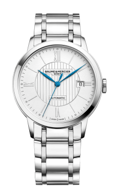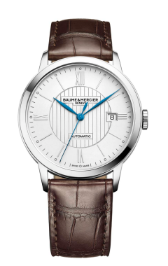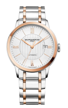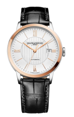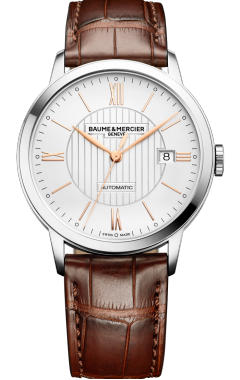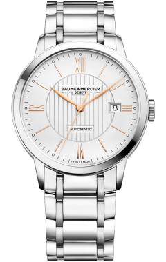 About this WatchThe Baume & Mercier Classima Automatic is a 40 mm dress watch with a date window at 3 o'clock and leaf-styled hands. The watch is powered by an automatic movement with a 38-hour power reserve and a frequency of 4 Hz / 28800 Vph.