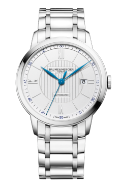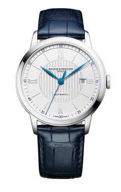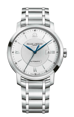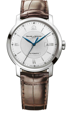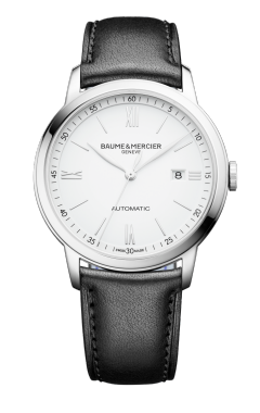 About this WatchThe Baume & Mercier Classima Automatic 42 mm comes in a steel case with the choice of a steel bracelet or leather strap. The dial includes a mixture of Roman numerals and indicies, and it features a date window at 3 o'clock.