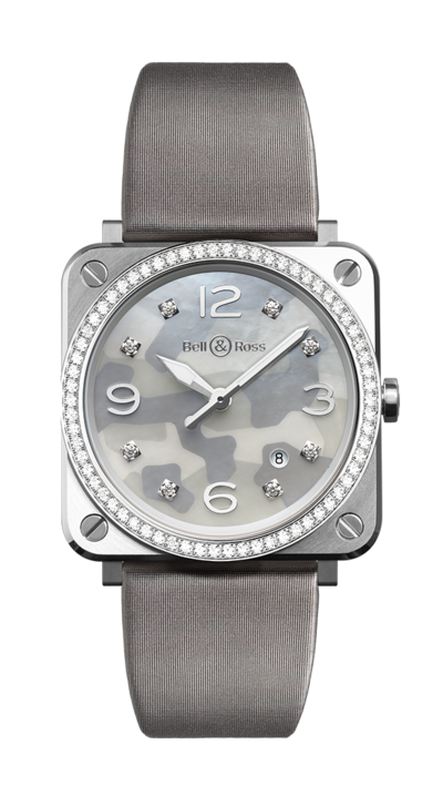 - Grey camouflage patterned mother of pearl. Metal appliqué numerals and diamond indices. Metal skeleton Superluminova-filled hour and minute hands.