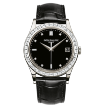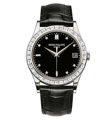 About this WatchThe Patek Philippe Calatrava 5298 features a bezel set with 38 baguette diamonds, a prong buckle set with 6 baguette diamonds, and a dial set with diamond hour markers. This model is available with a platinum case and black leather strap.