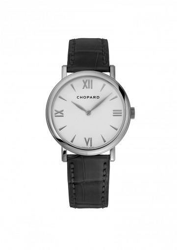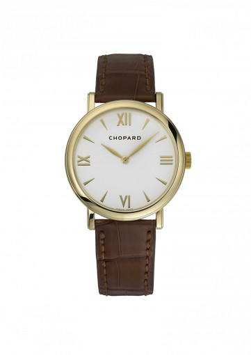 About this WatchThe Chopard Classic 36 mm is an elegant ladies watch with a sophisticated dial and a dressy leather strap. Sitting at 36 mm wide, this Chopard dress watch celebrates the current large-case trend.