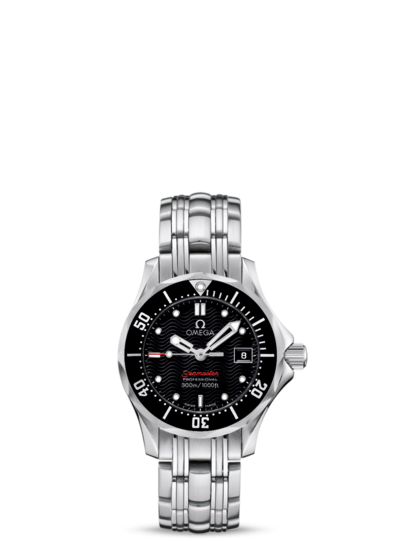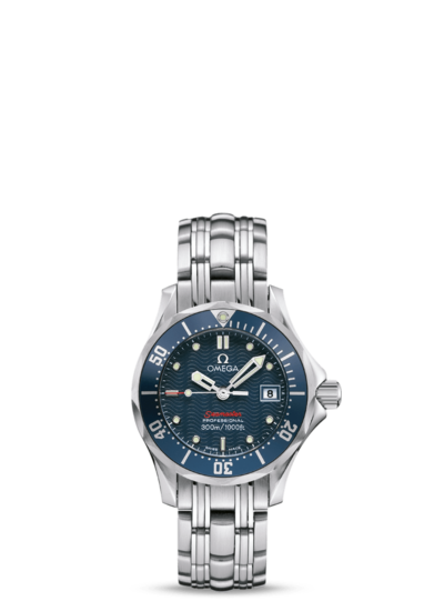 About this WatchThe Omega Seamaster Diver 300m Quartz is a ladies watch with a sporty appearance. Both watches are available with a stainless steel case and bracelet. The dial features a black or blue wave pattern and a date window at 3 o'clock.