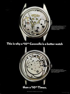 Often, I see trays of watches from the 1950s that will have a Timex, Caravelle, Helbros, and Hamilton priced the same. Ironic, since Caravelle, Helbros, and Hamilton offer watches with significantly better quality than Timex watches. This is because of brand name awareness. Everyone knows Timex. They have great staying power in the market. When it comes to vintage watches though, the quality of a Timex pales in comparison to many lesser known American / Swiss brands. I think this advertisement from the 60s sums it up.